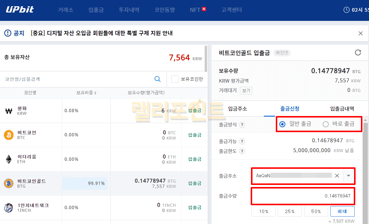 업비트간 바로출금을 이용하면 코인 출금수수료는 무료이니 바로출금을 추천드립니다.