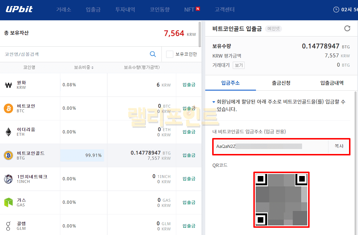 11. 내 코인 입금주소와 QR코드를 확인합니다.