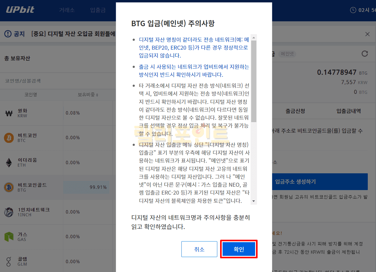 10. 코인 입금 주의사항에서 확인을 클릭합니다.