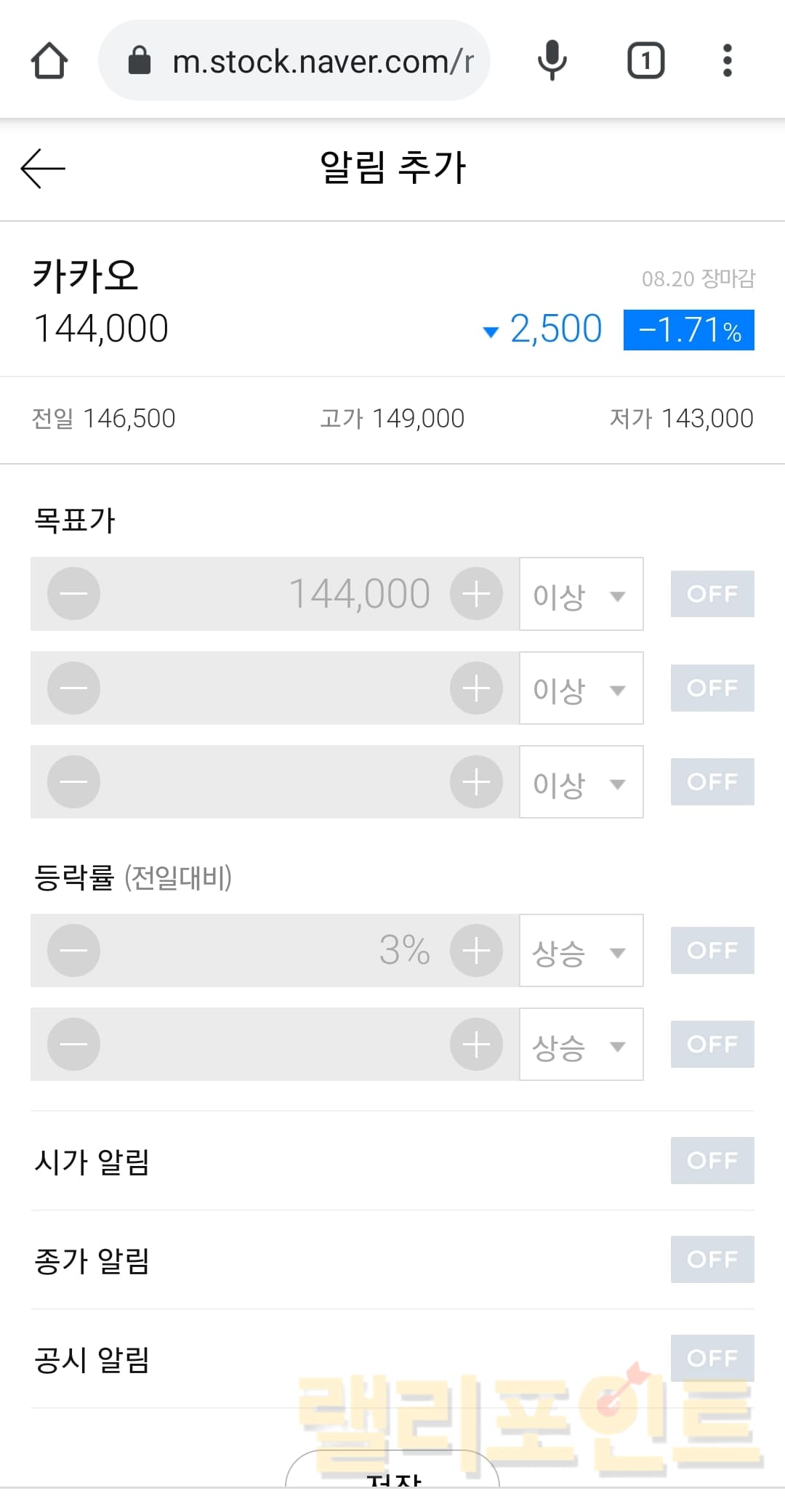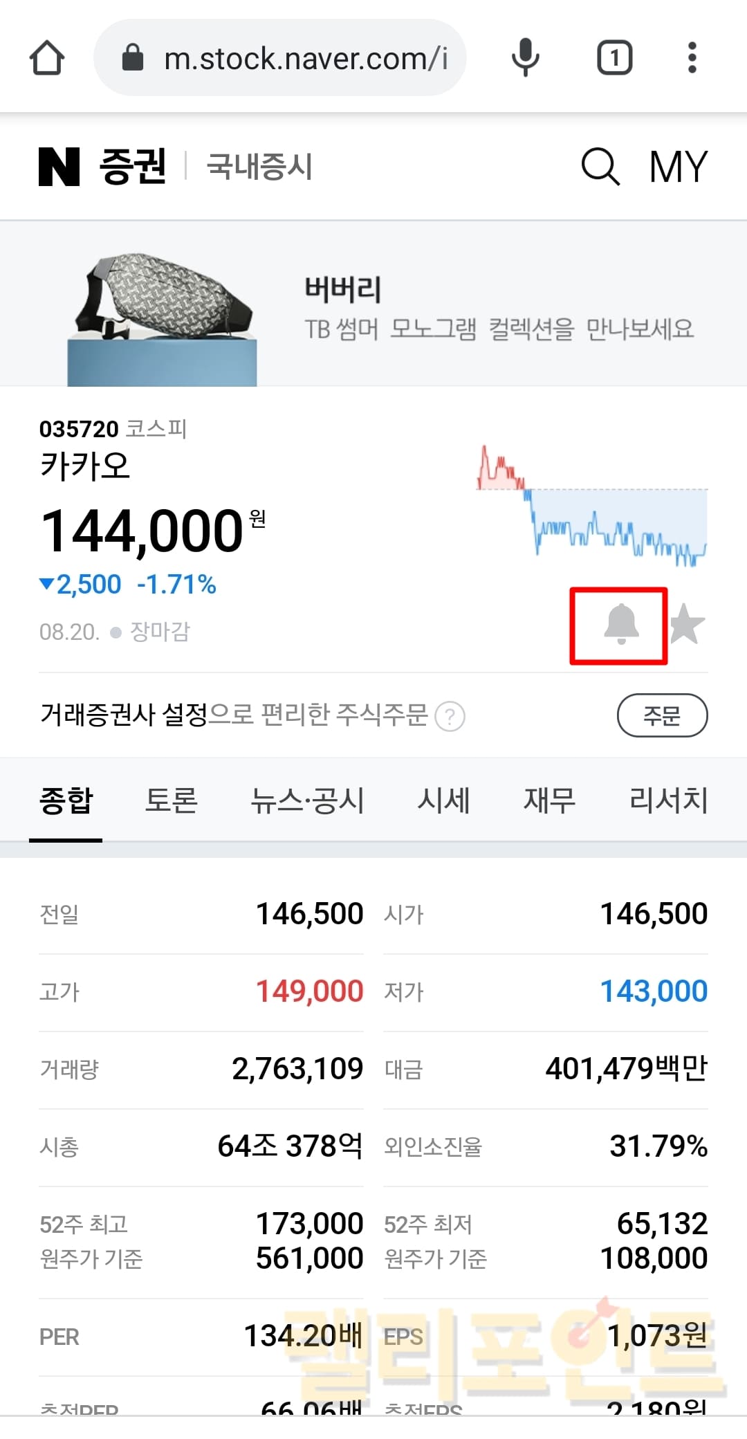 1. 네이버금융에서 보고 있는 주식 페이지에서 알림 버튼을 누릅니다.