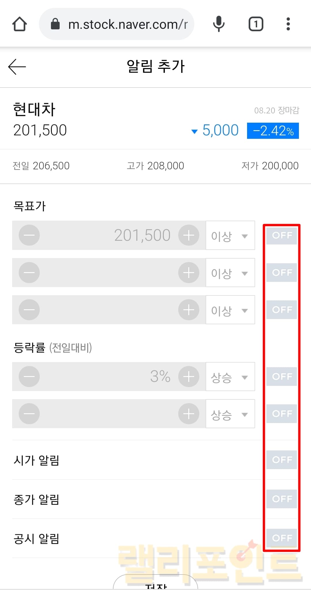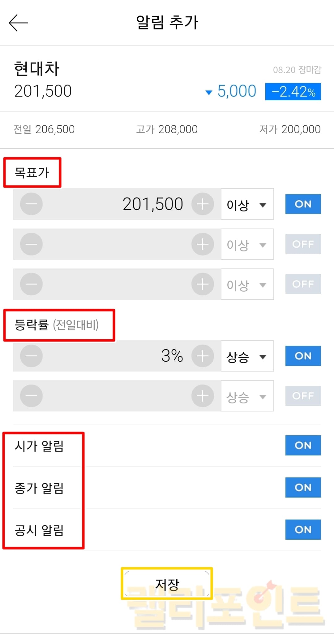 - 등락률: 전일대비 가격이 설정한 등락률에 도달하면 알림이 울립니다.