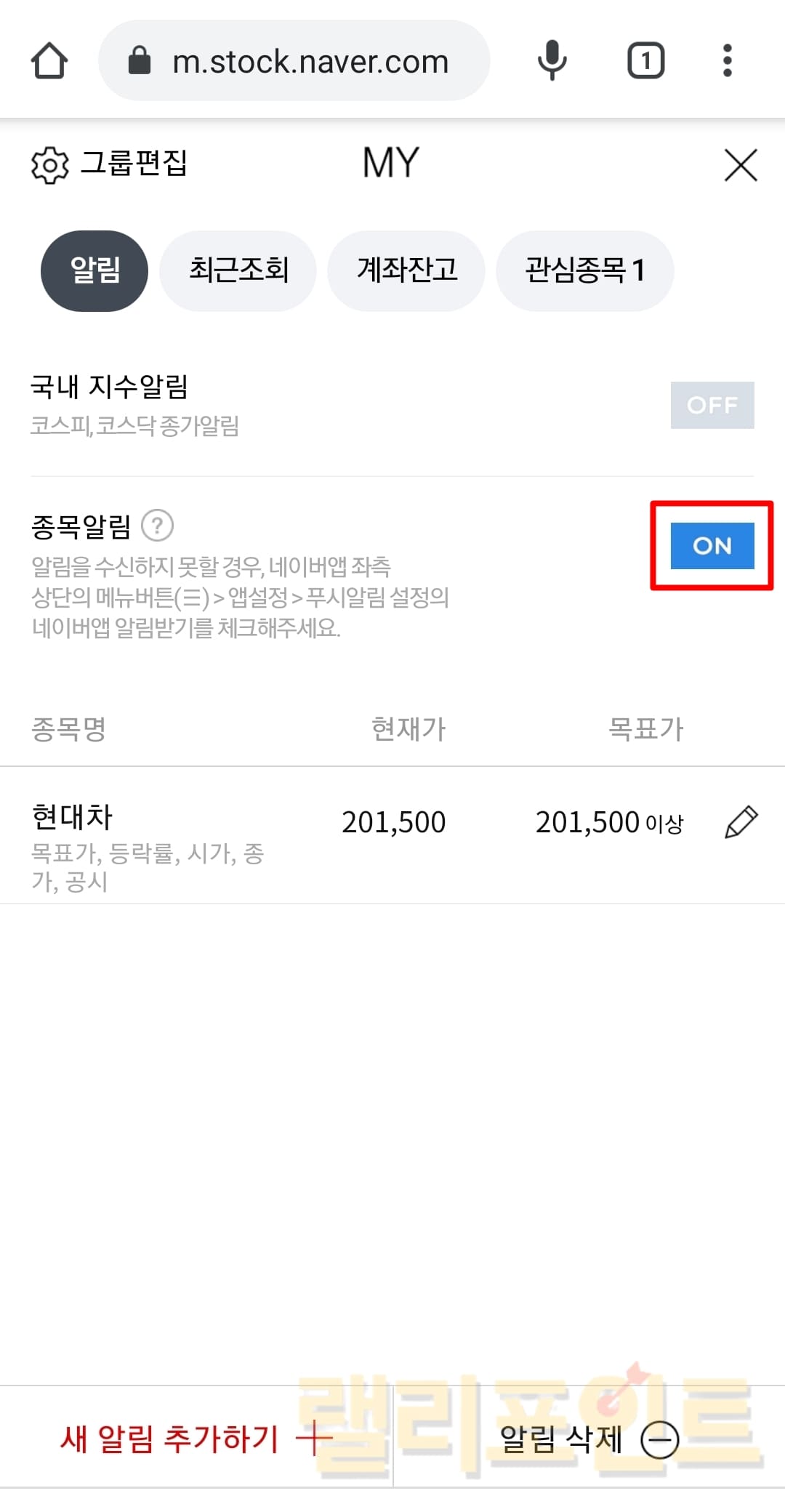 6. 종목을 알림 추가하시겠습니까?에 예를 누릅니다.