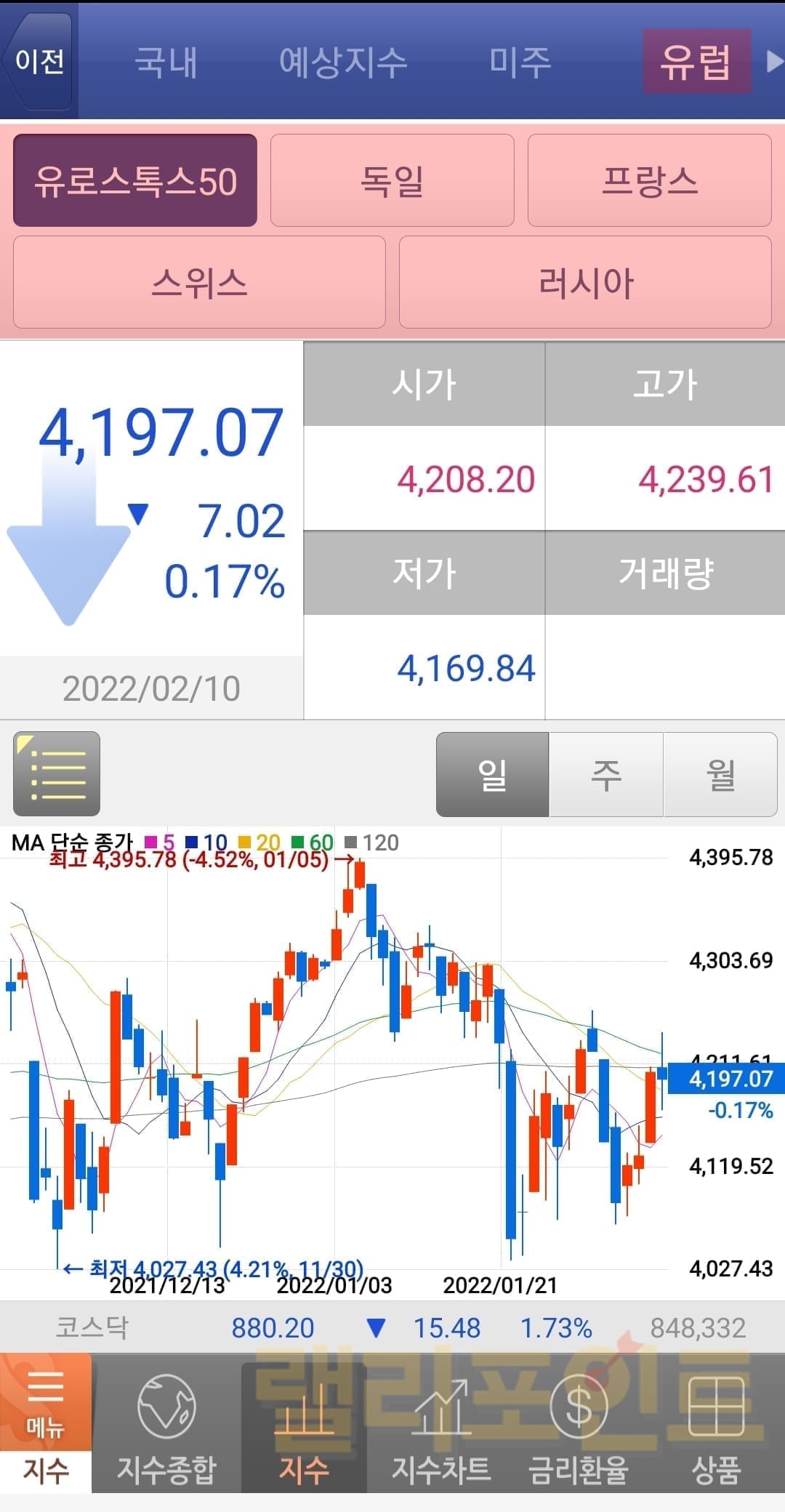 유럽의 경우 유로스톡스50, 독일, 프랑스, 스위스, 러시아 지수차트를 볼 수 있습니다.