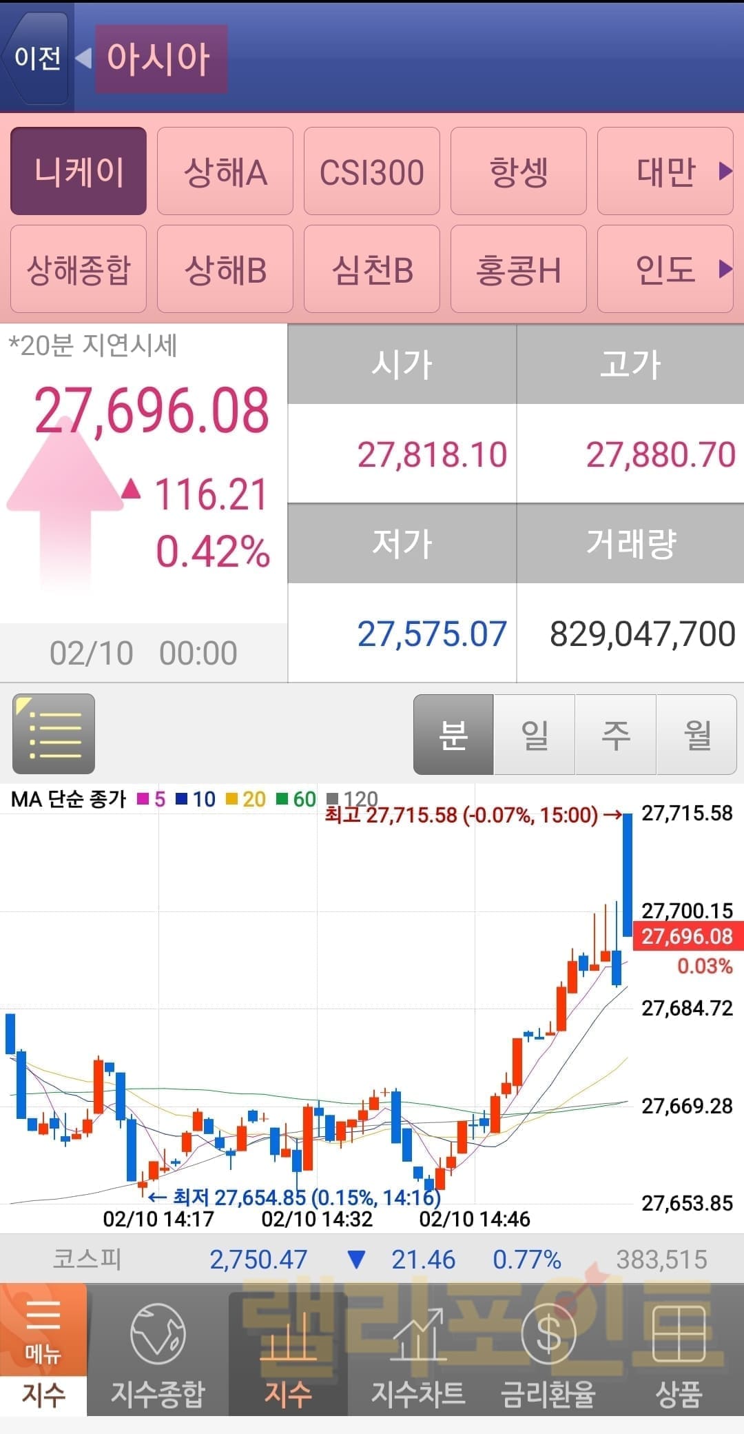 아시아의 경우 니케이, 상해A, CSI300, 항셍, 대만, 상해종합, 상해B, 심천B, 홍콩H, 인도 지수차트를 볼 수 있습니다.