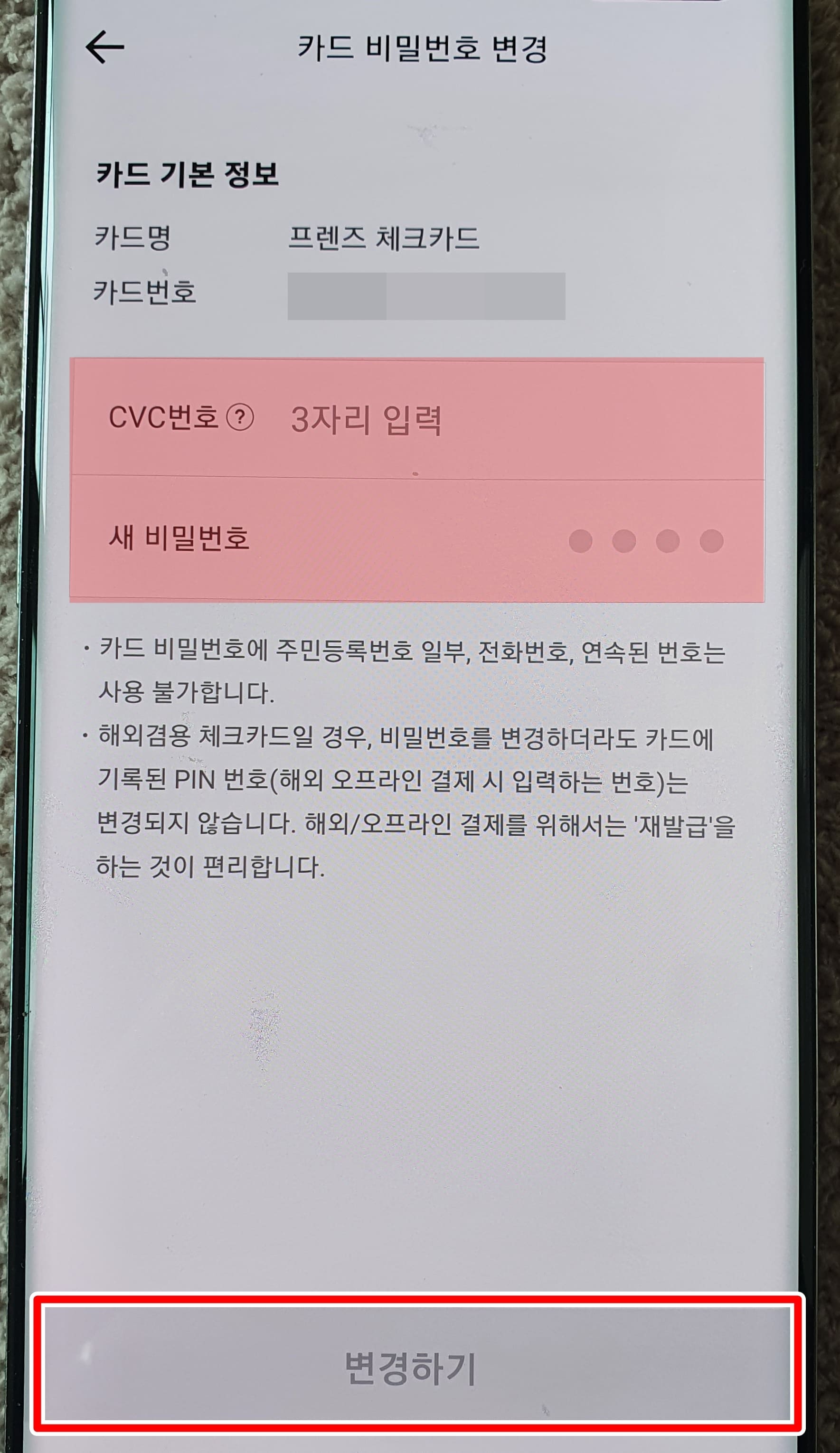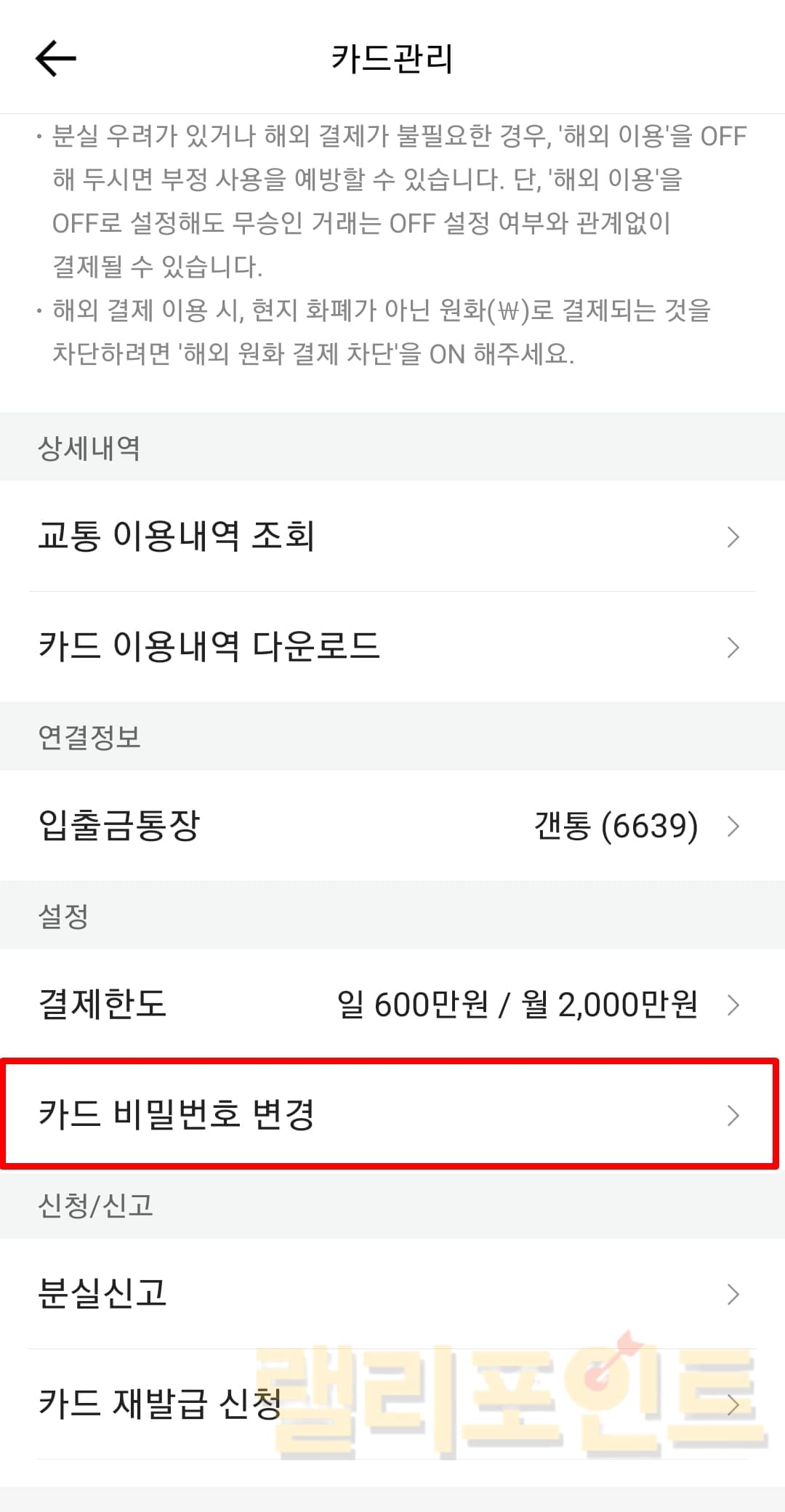 5. 카드 비밀번호 변경을 누릅니다.
