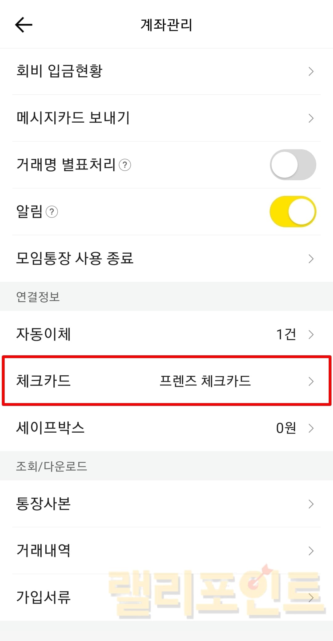2. 카드와 연동된 통장을 클릭합니다.
