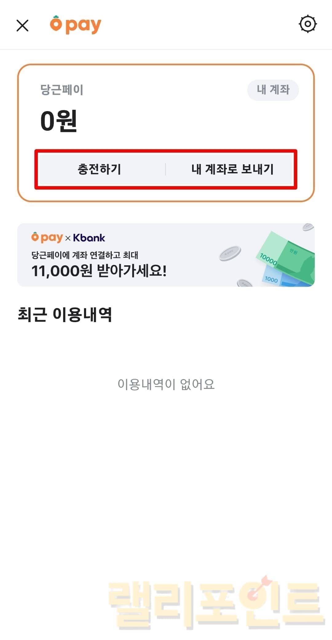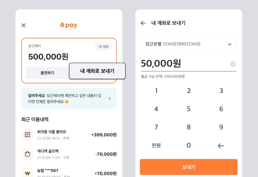 나의당근에서 충전하기를 눌러 당근페이의 금액을 충전할 수 있습니다. 내 계좌로 보내기를 누르면 연결한 계좌로 당근페이 머니를 출금할 수 있습니다.