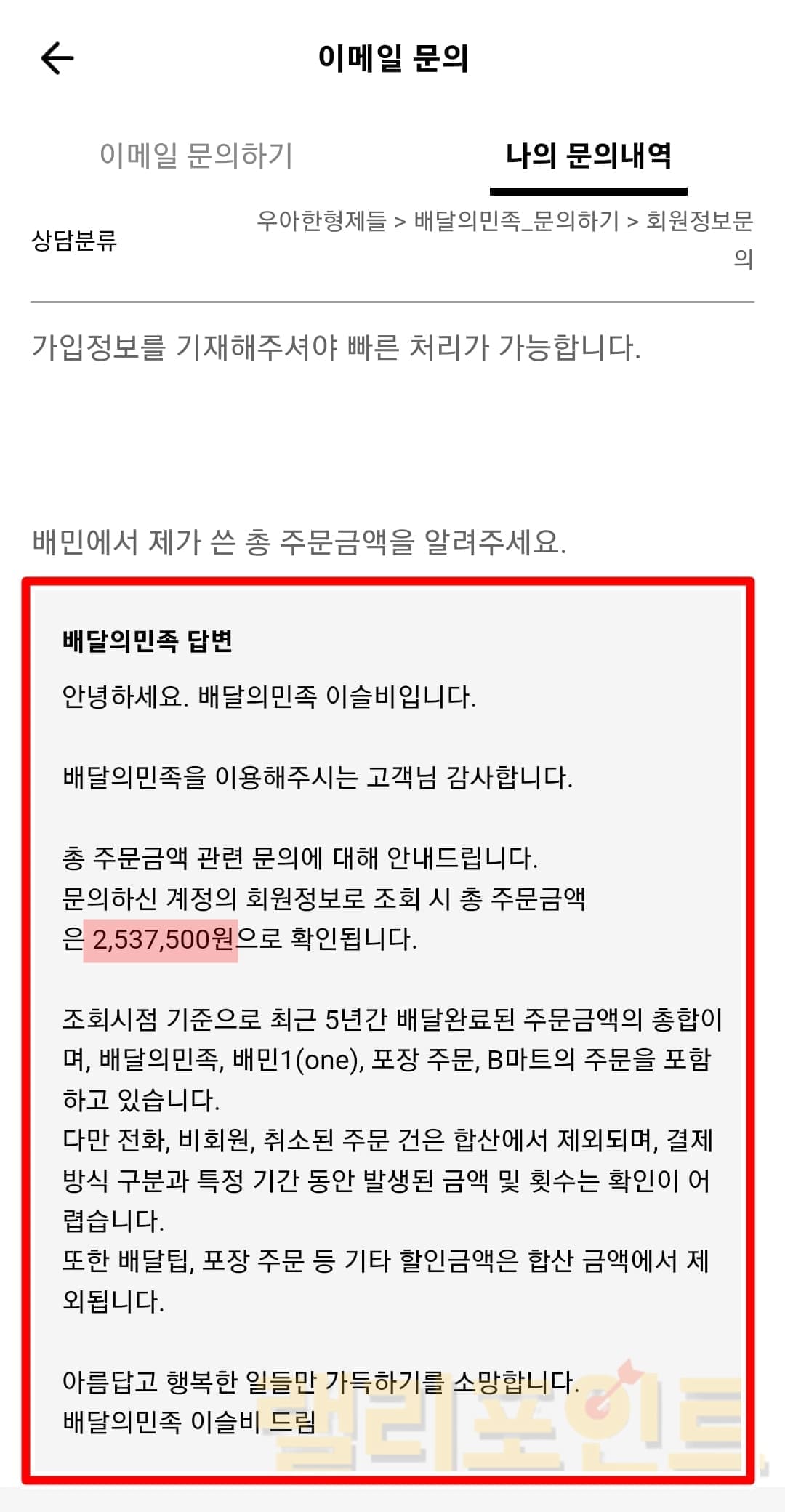 9. 처리완료 후 답변에서 나의 배달의민족 총 주문금액을 확인합니다.