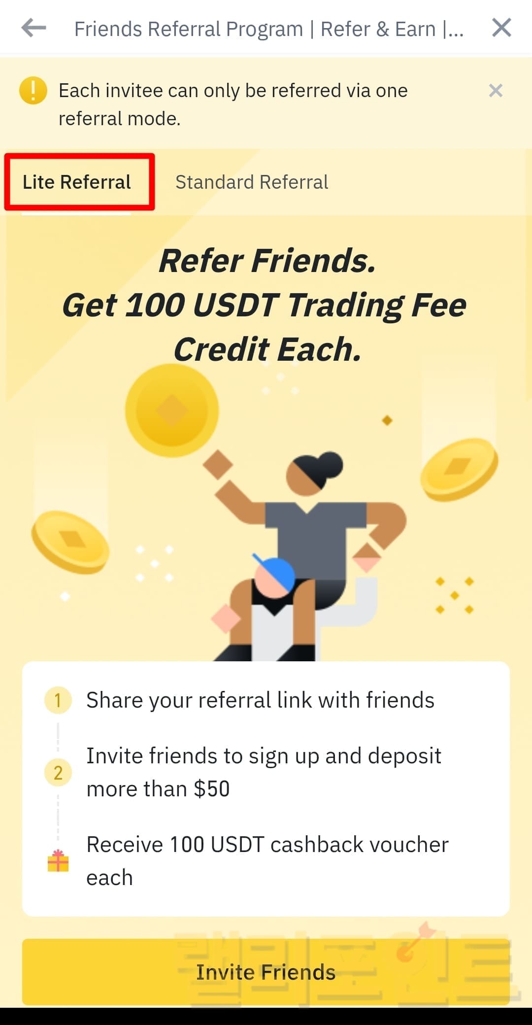 위에서 설명드린 화면은 바이낸스 프로모드입니다. 라이트모드에서는 아래 방법으로 레퍼럴 화면으로 이동할 수 있습니다.