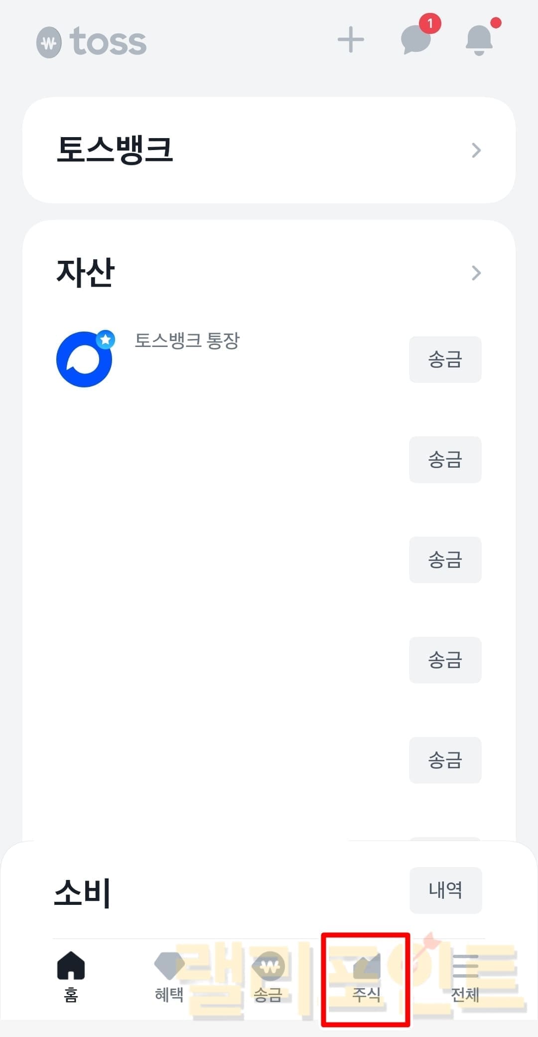 1. 토스 앱에서 주식 메뉴를 클릭합니다.