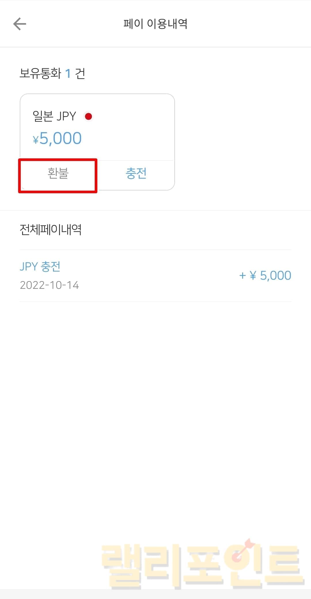 1. 트래블월렛 페이 탭 선불충전금에서 충전한 외화를 클릭합니다.