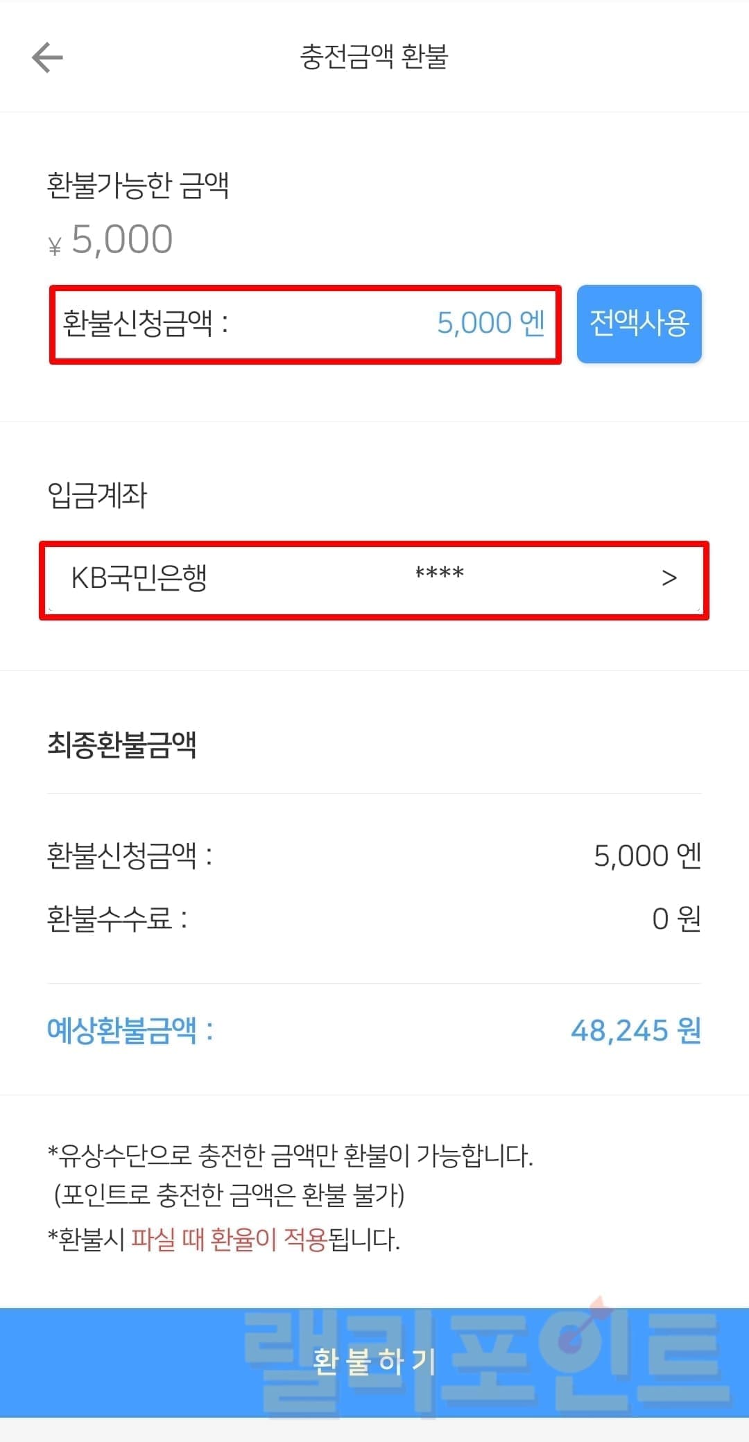4. 환불하기를 누르면 원화로 환전됩니다.
