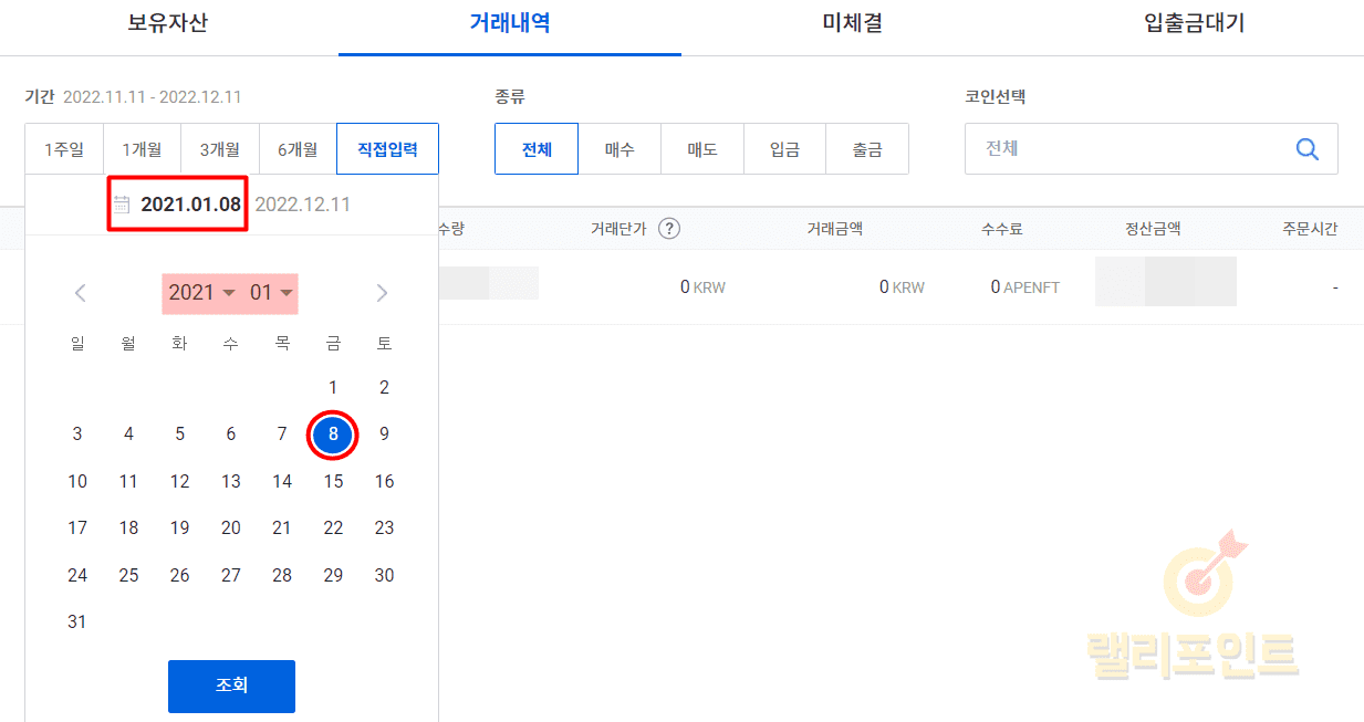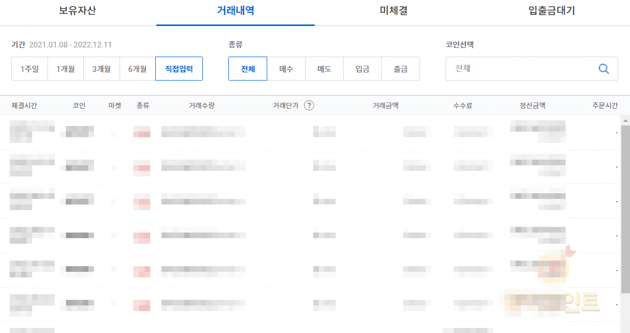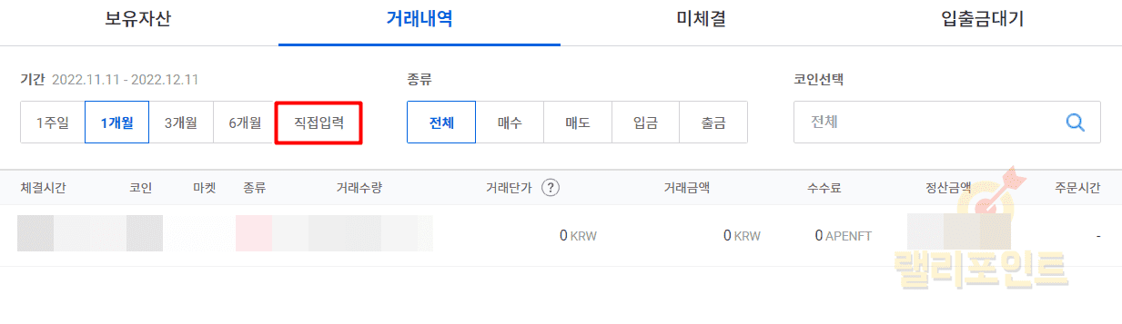 기본적으로 업비트 거래내역 조회는 1개월로 설정되어 있습니다. 전체 내역을 확인하거나 특정 기간의 거래내역이 필요하시다면 꼭 기간을 변경해주시길 바랍니다.