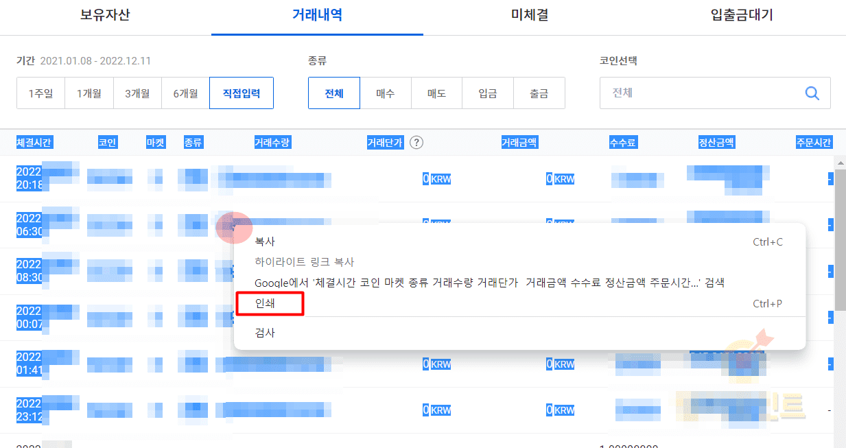 그래서 업비트 거래내역 확인 방법과 업비트 거래내역 출력 방법을 모두 알고 계시는 것이 중요합니다. 참고로 거래내역의 확인은 업비트 PC나 웹에서 모두 가능하지만 출력과 엑셀 작업으로 거래내역을 뽑아보고 싶으시다면 PC를 이용하셔야만 합니다.
