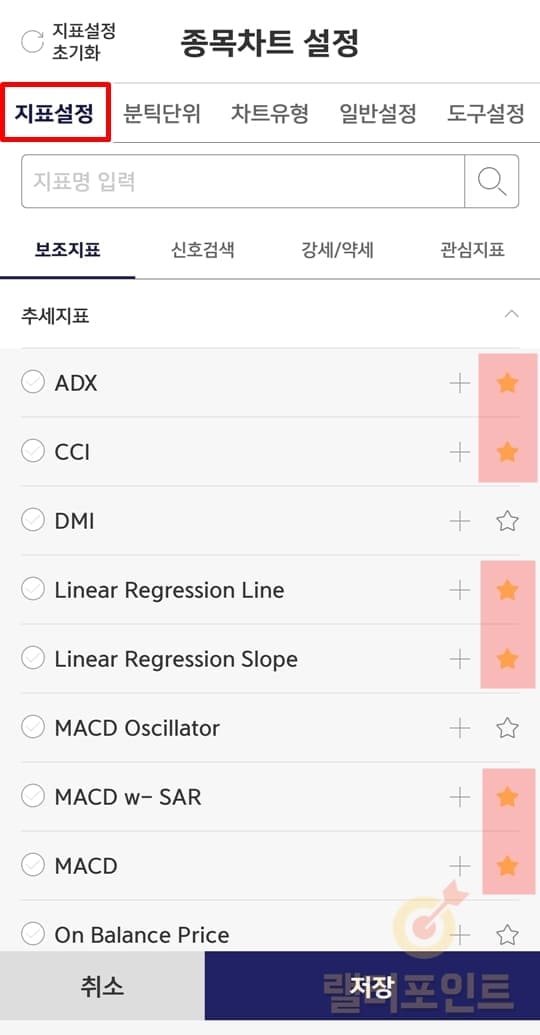 별 모양으로 추가된 지표는 이제 차트 설정의 지표 목록에 추가되어 쉽게 체크하여 사용할 수 있습니다. 참고로 여기서 제가 놀랐던 점은 영웅문S# 차트 지표에서는 HTS/MTS를 통틀어 설정할 수 있는 모든 지표가 있었다는 것입니다. 그래서 기존 HTS에서만 사용가능했던 마이너한 지표들도 이제 영웅문S# 차트에 추가하여 설정할 수 있게 되었습니다.