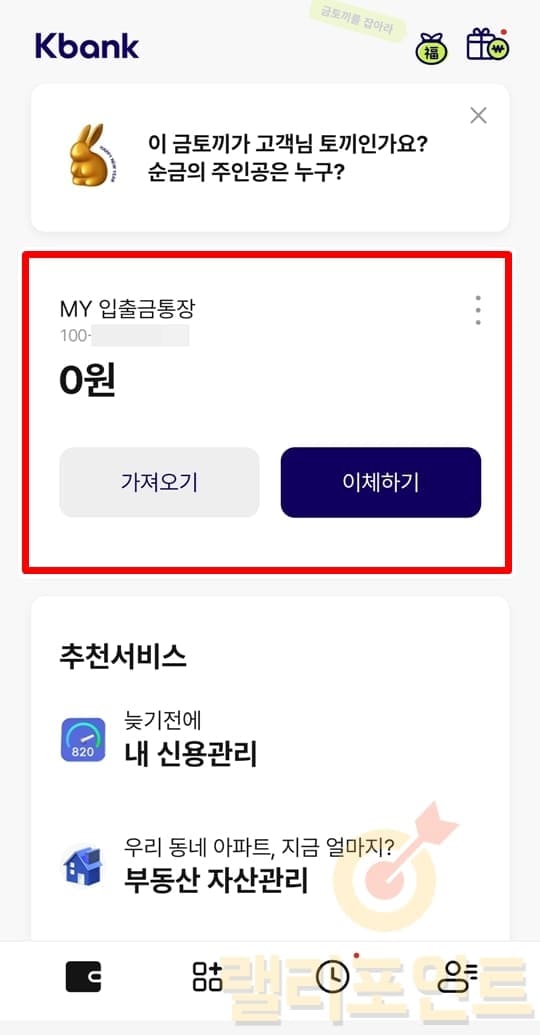 10. 케이뱅크 입출금통장에 입금된 돈을 확인합니다.