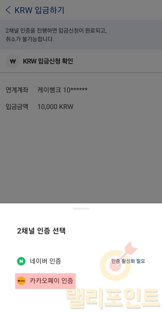 실명확인된 내 명의의 케이뱅크 계좌와 2채널 인증을 진행하셔야지만 업비트에 원화 돈을 입금할 수 있습니다. 따라서 케이뱅크 계좌가 없으신 분들은 아래 방법을 계속 참고하셔서 인증 및 등록을 진행해주시기 바랍니다.