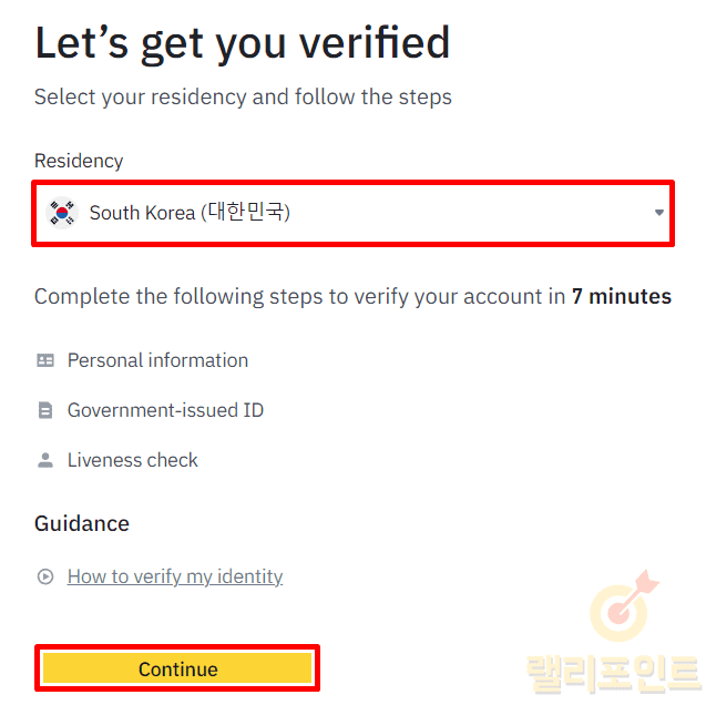 9. Residency에서 대한민국을 찾아서 선택하고 Continue를 누릅니다.
