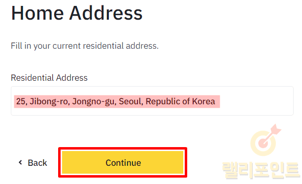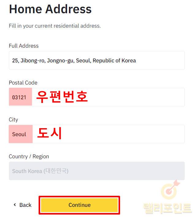 16. 영문주소를 입력하고 Continue를 클릭합니다.
