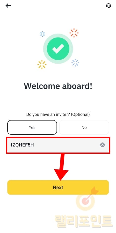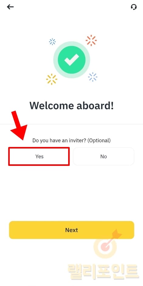 Do you have an inviter? (Optional)은 입력할 레퍼럴 추천인 코드가 있냐는 뜻입니다. 여기서 NO를 선택하거나 그대로 넘어가게 되면 레퍼럴 추천인 혜택을 받지 못하여 다시 재가입해야 하는 경우가 생기는 만큼 반드시 YES를 클릭하세요.