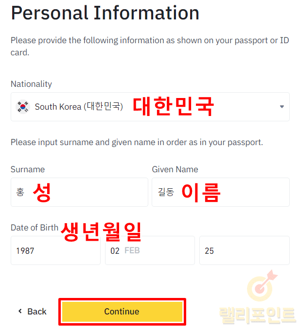 18. 내 정보 화면에서 국가, 이름, 생년월일, 주소를 확인 후 Continue를 클릭합니다.