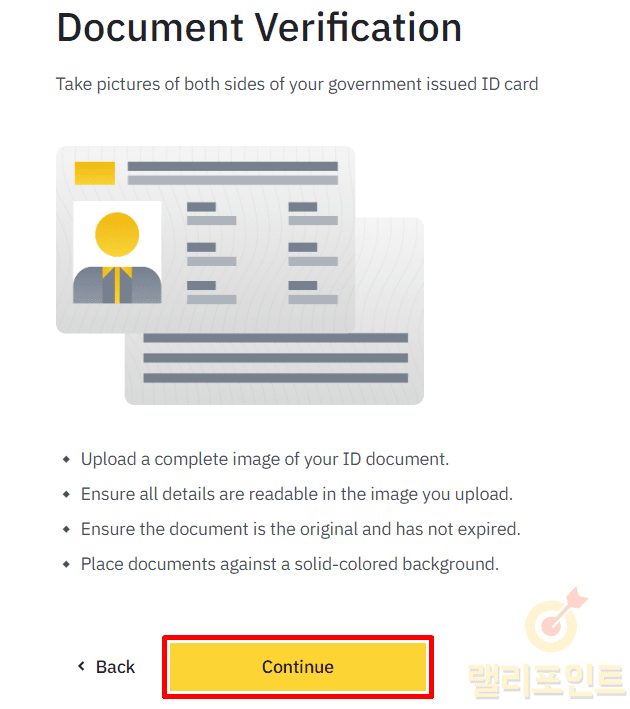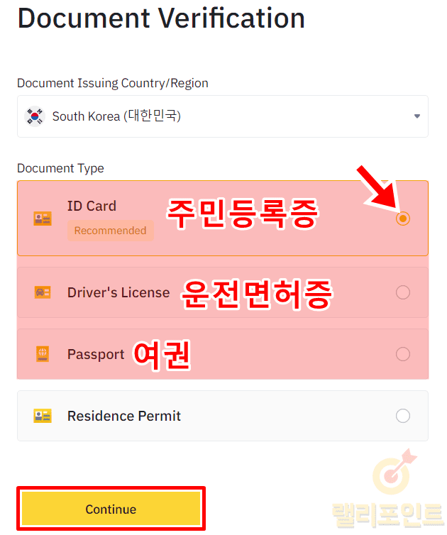 18. 인증에 사용할 신분증을 선택하고 Continue를 누릅니다.