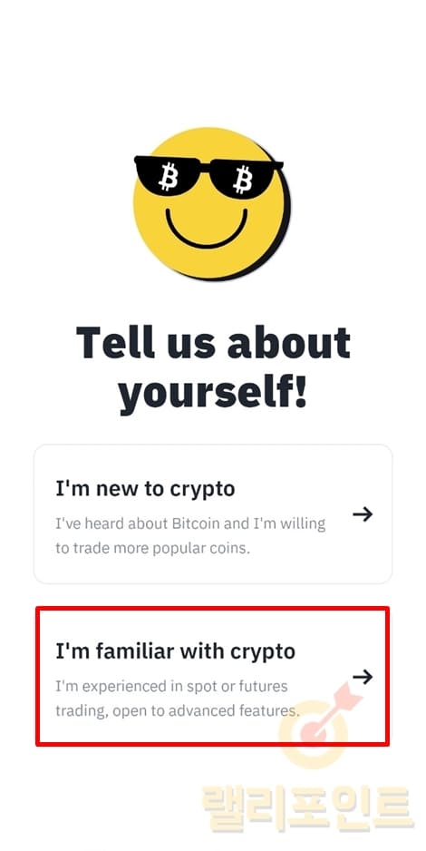 2. 바이낸스 앱을 실행하고 I`m familiar with ctypto를 선택합니다.