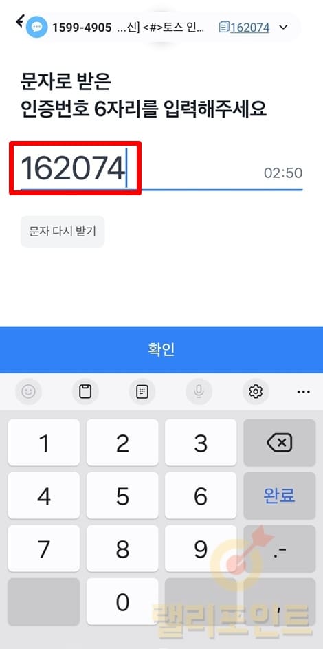 8. 문자로 받은 인증번호 5자리를 입력합니다.