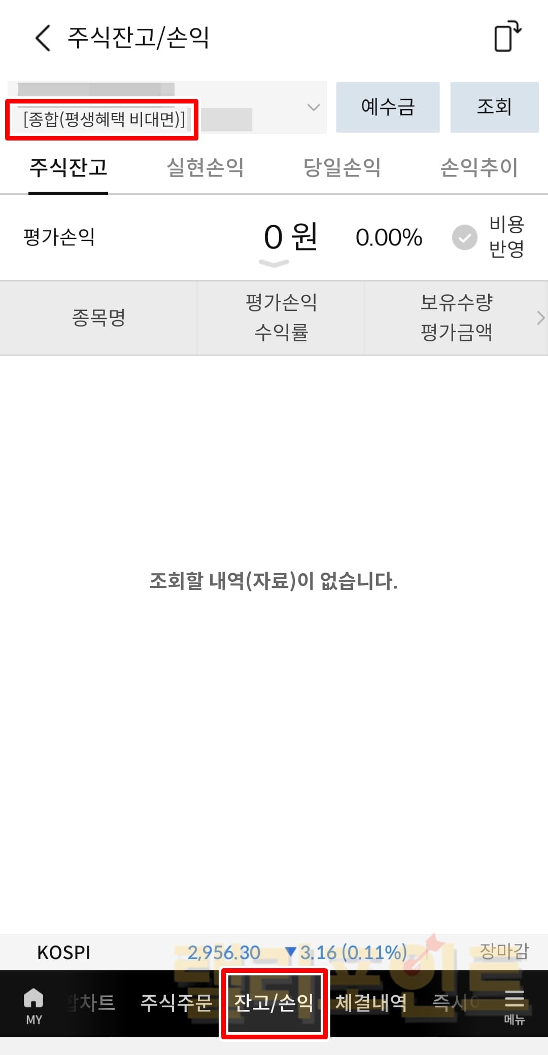 참고로 잔고/손익 메뉴에 들어가셔서 상단에 보이는 나의 증권계좌 내역에서도 (평생혜택 비대면) 표시가 있다면 현재 삼성증권 주식 수수료 우대 혜택이 적용되고 있는 중임을 쉽게 확인할 수 있습니다.