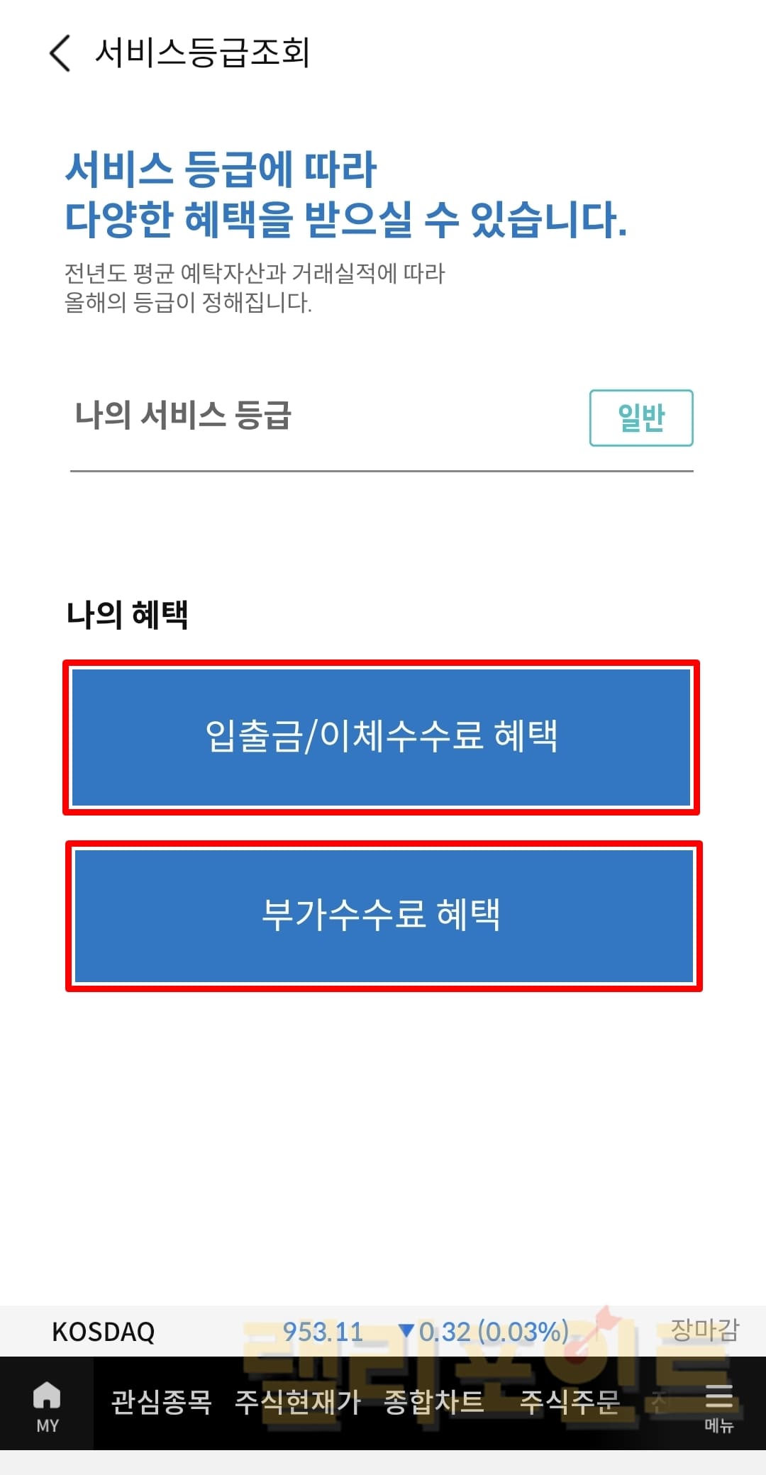 4. 나의 서비스 등급별 입출금/이체수수료 금액을 확인합니다.