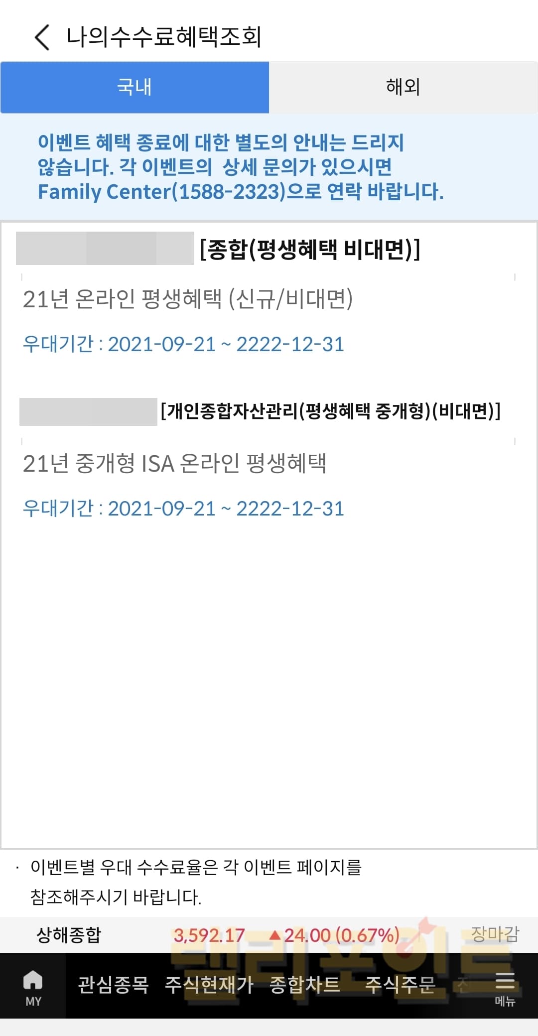 5. 주식 수수료 평생혜택 적용 및 적용 기간을 확인합니다.