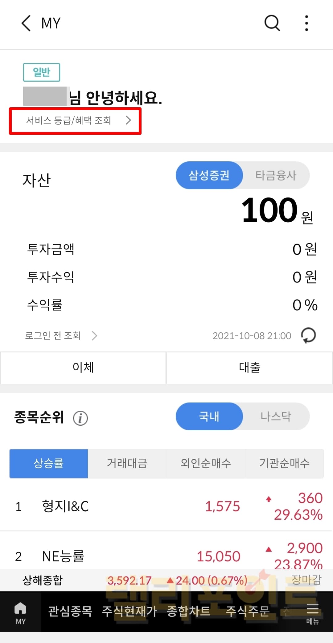 2. 서비스 등급/혜택 조회를 누릅니다.