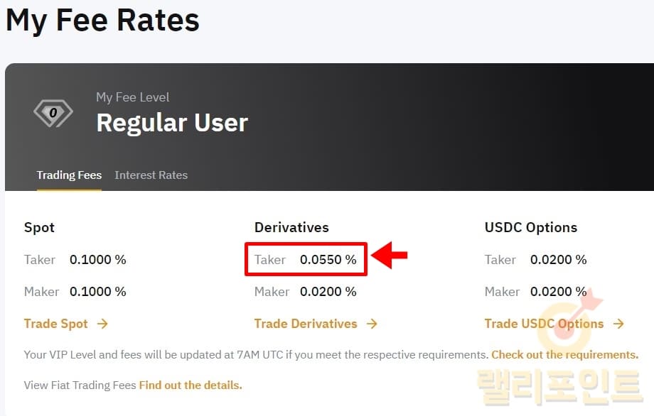 5. Derivatives Trading Fee 아래 Taker 수수료를 확인합니다.