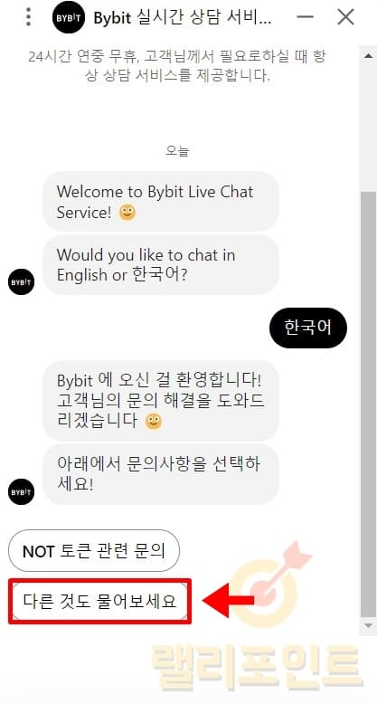 이곳에서 나의 바이비트 레퍼럴 코드를 물어보거나 현재 적용된 레퍼럴 코드 및 혜택을 상담원에게 직접 물어볼 수 있습니다. 만약 레퍼럴 코드가 적용하지 않은 상태로 가입하여 현재 아무런 혜택이 적용되어 있지 않다면 최대 혜택 레퍼럴 코드인 [54761]로 적용 또는 변경을 요청하시는 것을 추천드립니다.