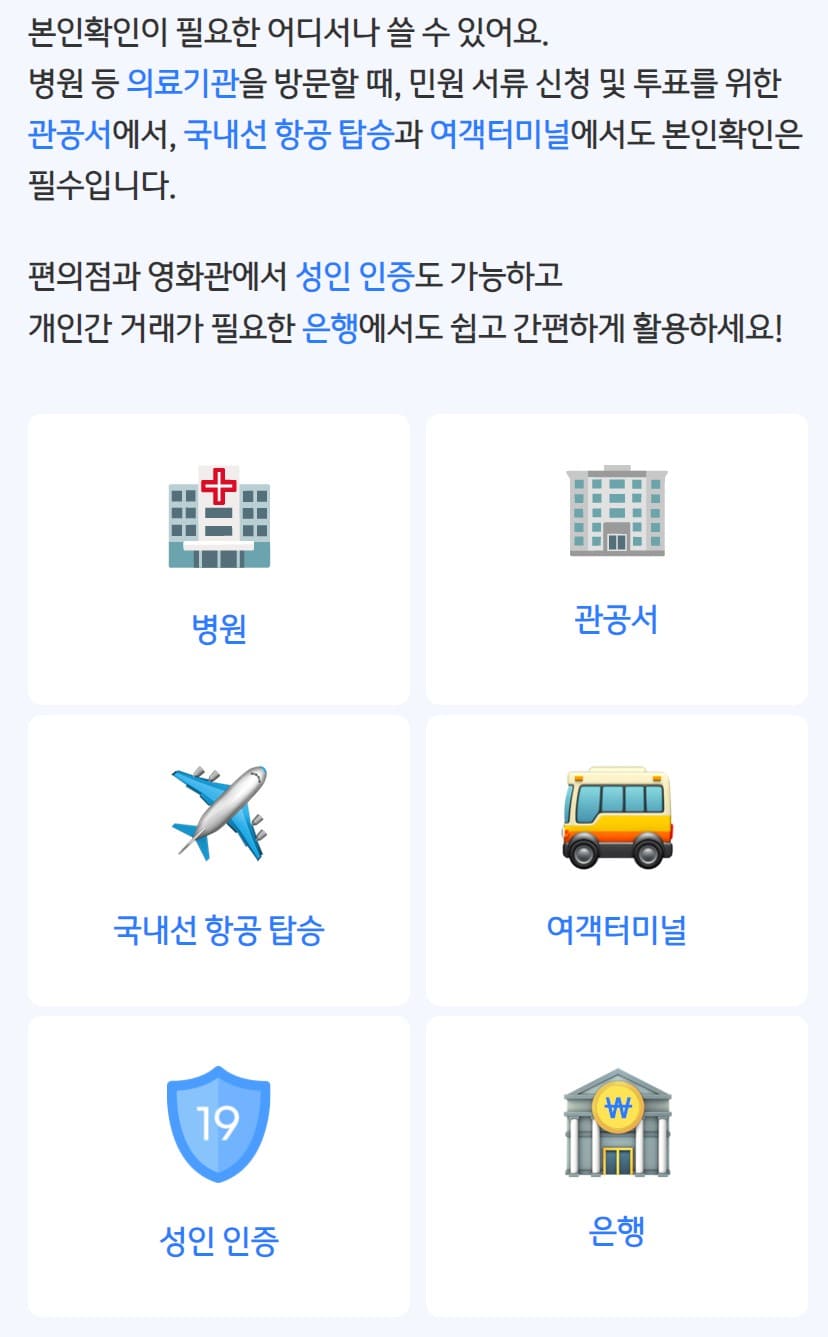 예를 들어서 병원이나 의료기관을 방문할때나 민원서류 및 투표를 위한 관공서, 국내선 항공탑승, 여객터미널 등에서도 이용이 가능합니다. 게다가 편의점, 영화관, 개인간 거래가 필요한 은행에서도 사용할 수 있습니다.