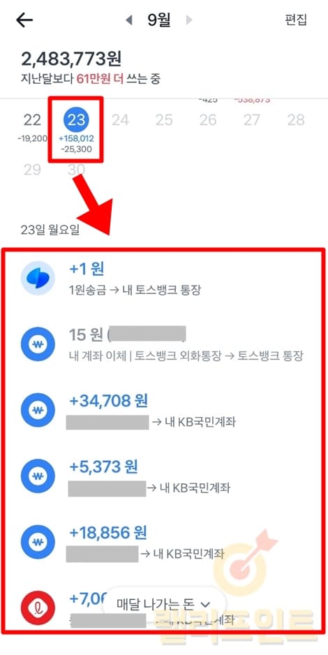 토스 가계부를 사용하는 첫번째 방법은 토스 가계부 캘린더 달력을 확인하는 것입니다. 달력에서는 소득은 +, 지출은 - 로 표시되어 있고 1달 합산된 소득-지출 금액을 보여줍니다. 또한 특정 날짜를 클릭하면 어떤 소득이 들어왔고 어떤 지출이 있는지도 확인할 수 있습니다.
