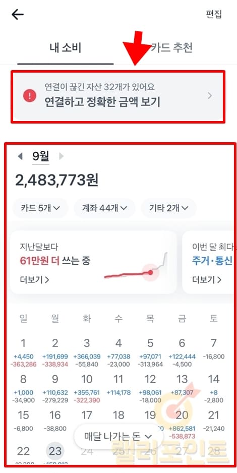 2. 홈 화면 아래에서 X월에 쓴돈(이번 달 쓴 금액)을 클릭합니다.