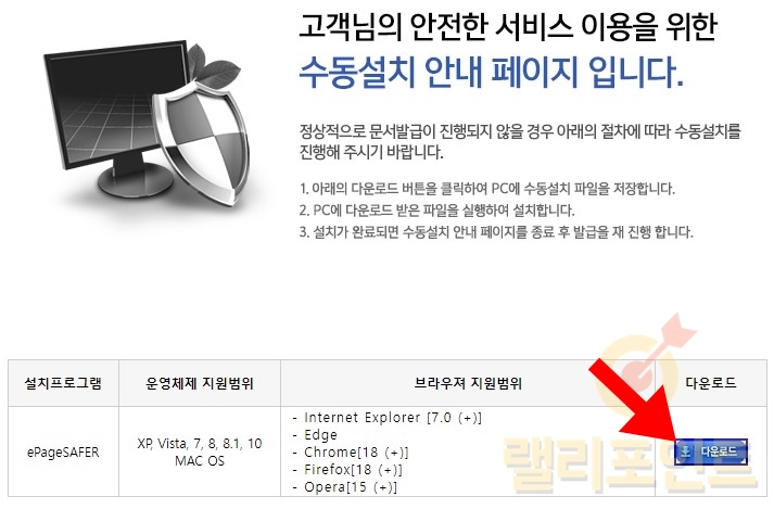 19. 처음 수동설치 안내 페이지가 실행되면 다운로드 버튼을 클릭합니다.