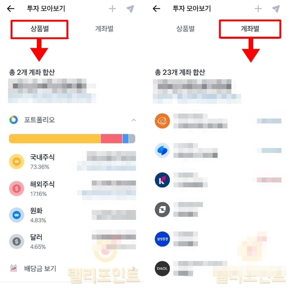 상품별로 내 명의의 주식 계좌 현황을 확인할 수 있고 이 때 국내주식, 해외주식, 원화, 달러 등 보유한 금액을 확인할 수 있습니다. 계좌별을 클릭하면 내 명의의 증권사 계좌별 금액 확인도 가능합니다. 많은 도움이 되셨길 바랍니다.