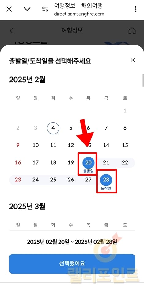 9. 가는날(출발일)과 오는날(도착일)을 설정합니다.