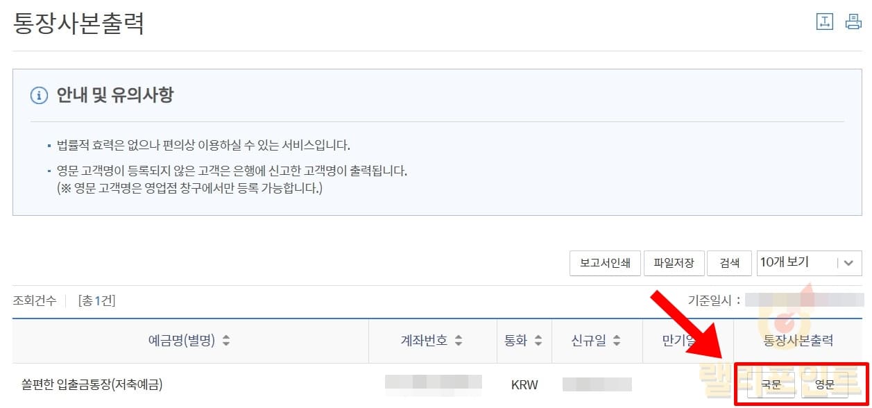 3. 계좌 우측에서 통장사본의 국문 또는 영문을 선택하여 클릭합니다.