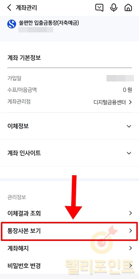 4. 관리정보 > 통장사본 보기를 클릭합니다.