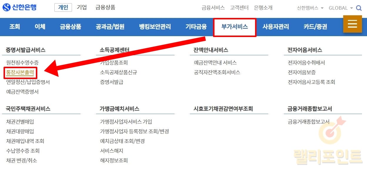 2. 상단 메뉴에서 부가서비스 > 통장사본출력을 클릭합니다.