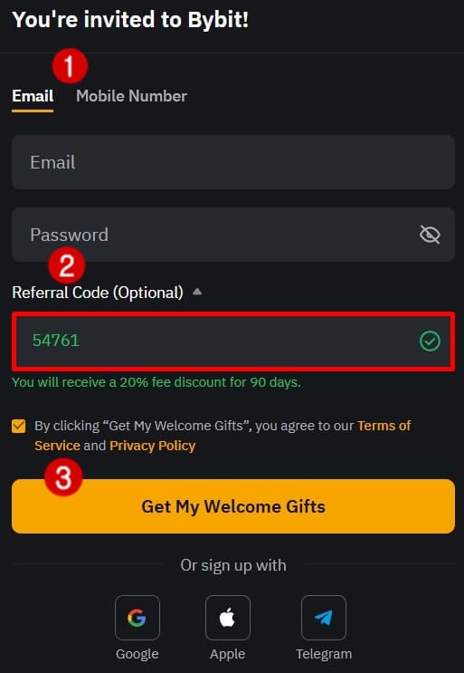 이렇게 바이비트에서는 회원 가입시 첫 화면 Refferral Code(Optional)에서 레퍼럴 추천인 코드를 등록할 수 있습니다. 이때 위의 바이비트 사이트 링크를 눌러서 진입하시면 20% 최대 수수료 감면 및 최대 3,000달러 이상의 달러 지급 쿠폰을 받을 수 있는 '54761' 코드가 자동 기입되어 있습니다. 만약 레퍼럴이 다른 코드로 적혀있거나 공백이시라면 [54761]을 직접입력하셔서 최대 헤택을 적용하시길 추천드립니다. 참고로 가입 절차에 어려움이 있다면 바이비트 가입 방법을 읽고 따라 진행하시면 됩니다.