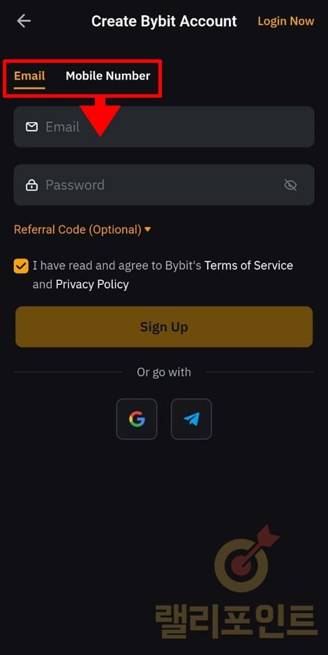 2. Email 또는 Mobile Number를 선택합니다.