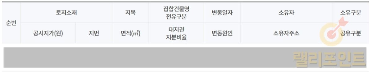 토지소재, 공시지가, 지번, 지목, 면적, 집합건물명 전유구분, 대지권 지분비율, 변동일자, 변동원인, 소유자, 소유자주소, 소유구분, 공유구분 정보를 확인할 수 있습니다.