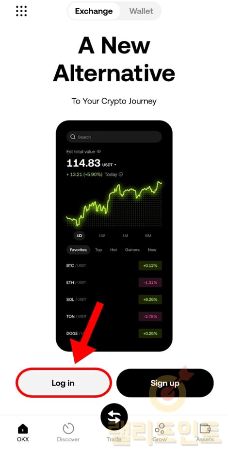 16. OKX 앱을 실행하고 Log in 버튼을 클릭합니다.