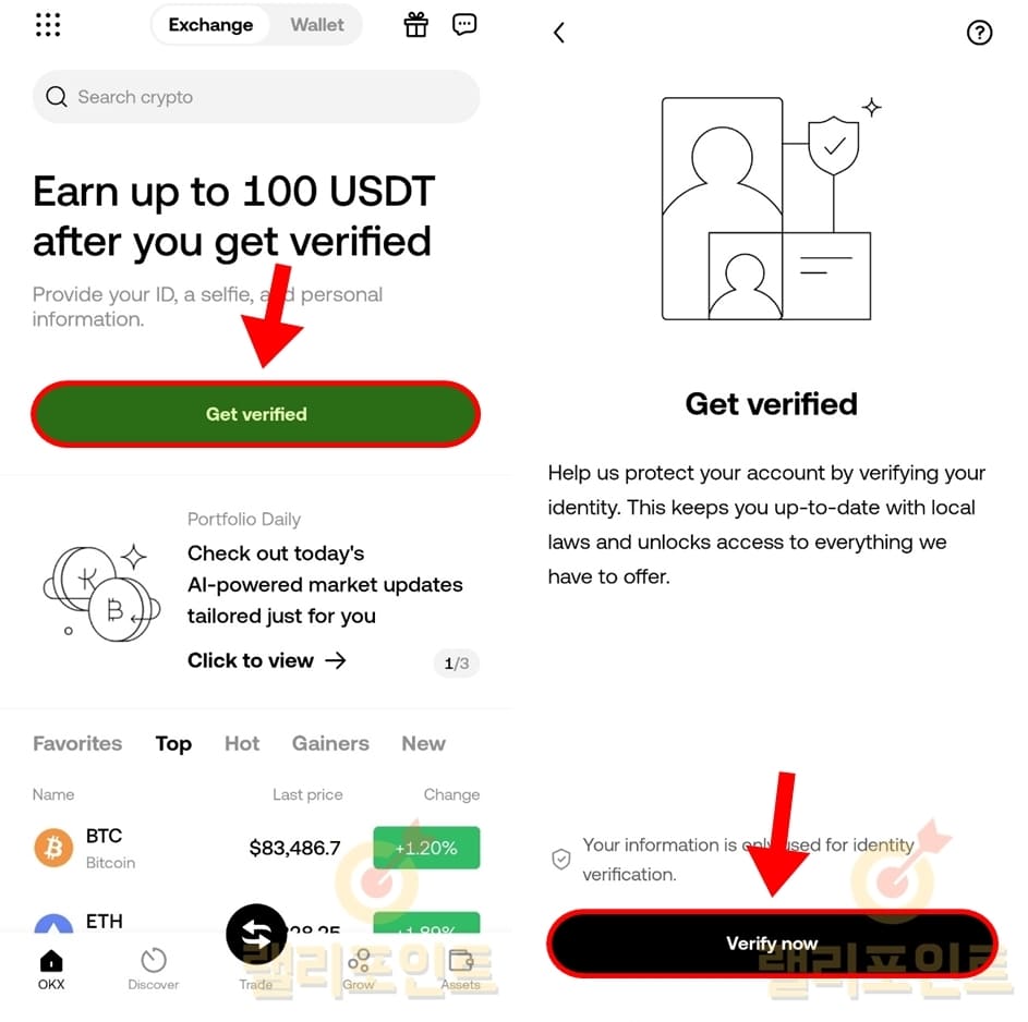 21. OKX 홈화면에서 Get Verified > Verift now를 클릭합니다.