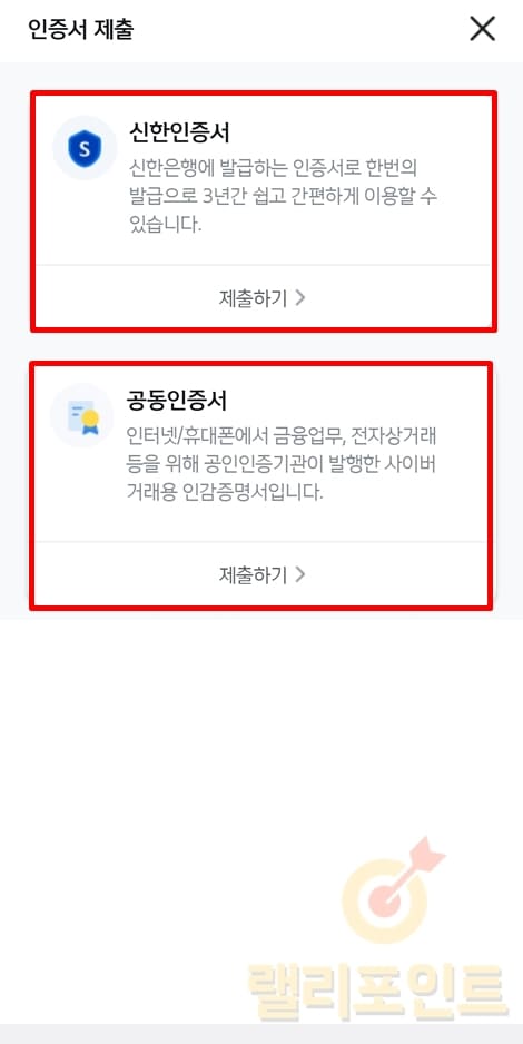 11. 신한인증서 또는 공동인증서를 선택한 후 인증합니다.