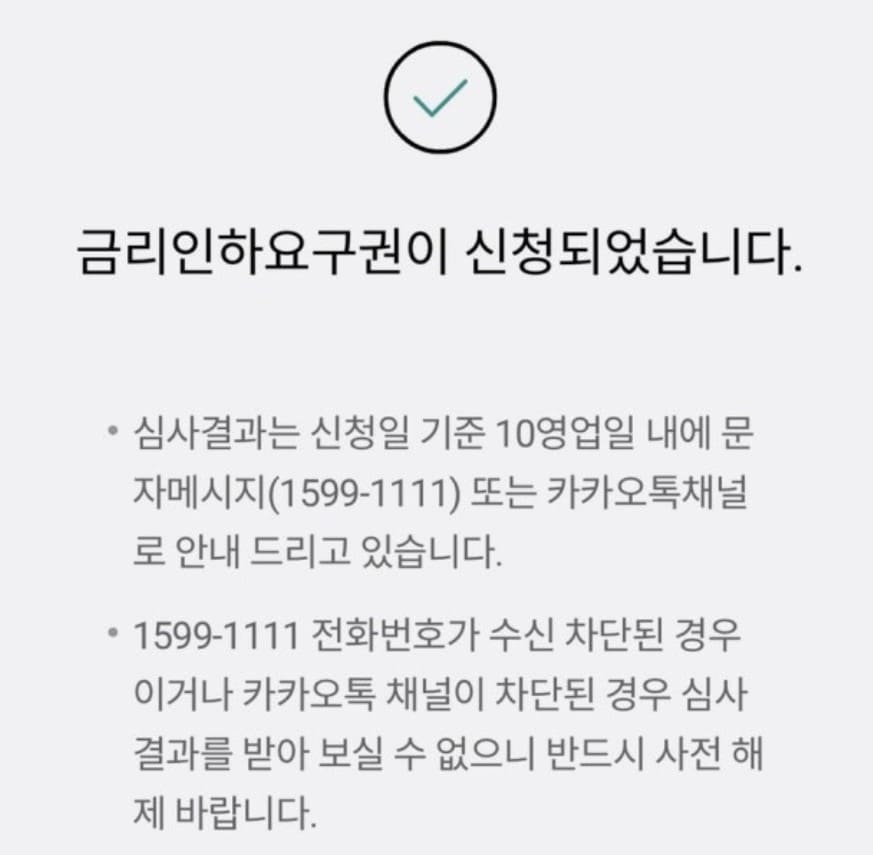 심사결과는 신청일 기준 10영업일 내에 문자메시지나 카카오톡채널로 안내받을 수 있습니다. 만약 현재 신청한 날짜가 평일 영업일이라면 즉시 금리가 낮춰지는 경우도 있으니 참고하시길 바랍니다.